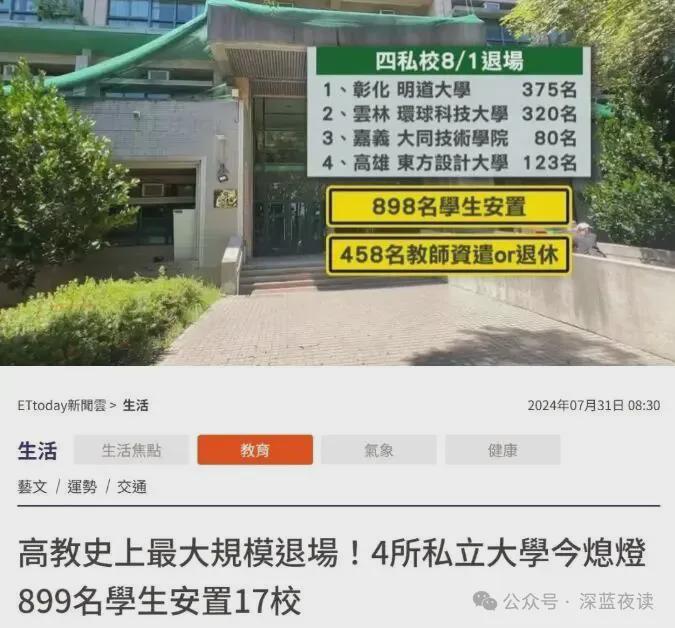• 中国台湾近年已经上演“退场潮”。2024年7月31日,四所私立大学同日停办。此前几年已有多所院校退出。政策层面出台《私立高级中等以上学校退场条例》,引导财务恶化学校有序关停,校园资产转作养老、办公等用途。